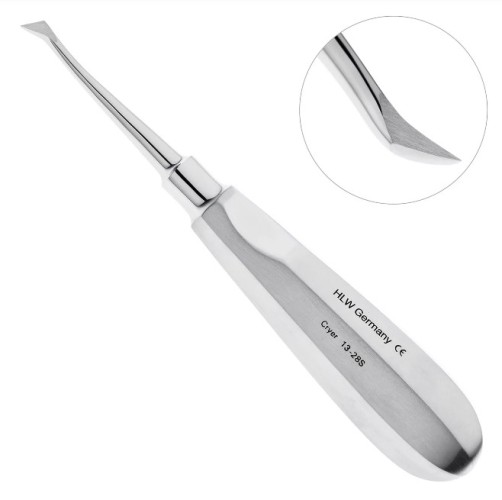 Для удаления корней и зубов на нижней челюсти используется элеватор конструкции Краера производства известной компании HLW Dental Instruments. Инструментом удобно проводить операцию по вывихиванию зуба, благодаря его конструкции. Рабочая часть изогнутого элеватора имеет треугольную форму и заостренный край. Щечка инструмента легко вводится между корнем зуба и стенкой альвеолы, и без особых усилий осуществляется удаление зуба вращением рукоятки элеватора по или против хода часовой стрелки. Восьмигранная укороченная ручка инструмента с выемкой под большой палец обеспечивает надежную фиксацию и предотвращает скольжение элеватора в ладони. Благодаря такой ручке инструмента снижается нагрузка на руки. Преимущества инструментов HLW Dental-Instruments: Инструменты HLW изготавливаются из высокопрочной коррозийно-устойчивой стали, отвечающей современным нормам медицинских инструментов (ISO 9001:2008; ISO 13485:2003). В основании шарнирного соединения всех щипцов для удаления зубов торговой марки HLW имеется тефлоновая вставка, обеспечивающая плавный ход инструмента. Инструменты HLW сделаны с учетом особенностей анатомии человека. Рабочие части инструментов снижают риск возникновения дополнительной травмы. Облегченные по весу ручки благодаря полой конструкции позволяют снизить нагрузку на руки. А эргономичная форма инструментов снижает риск развития кистевого туннельного синдрома. Поверхность щипцов отполирована до зеркального блеска, что придает им эстетичный вид. HLW Dental-Instruments предоставляет гарантию на свои инструменты 1 год.